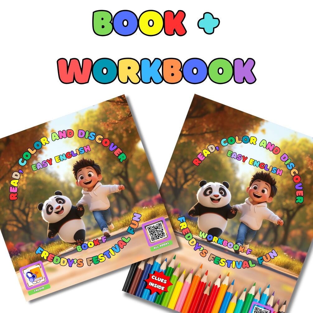 The storybook “Freddy’s Festival Fun” introduces key grammar and vocabulary in a fun, engaging way, while the workbook provides hands-on activities to reinforce learning.